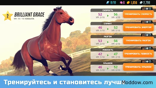 Rival Stars Horse Racing is a game for those who love horses or gambling, for example horse racing where you can place bets. In the game, you will act as a breeder and you will need to breed a real stallion who will make everyone on the hippodrome. You are responsible for your animals, and you will perform in three specializations at once: trainer, jockey and breeder! As you progress through the game, you will be able to upgrade your buildings and horse pens, as well as hire employees to work for you!